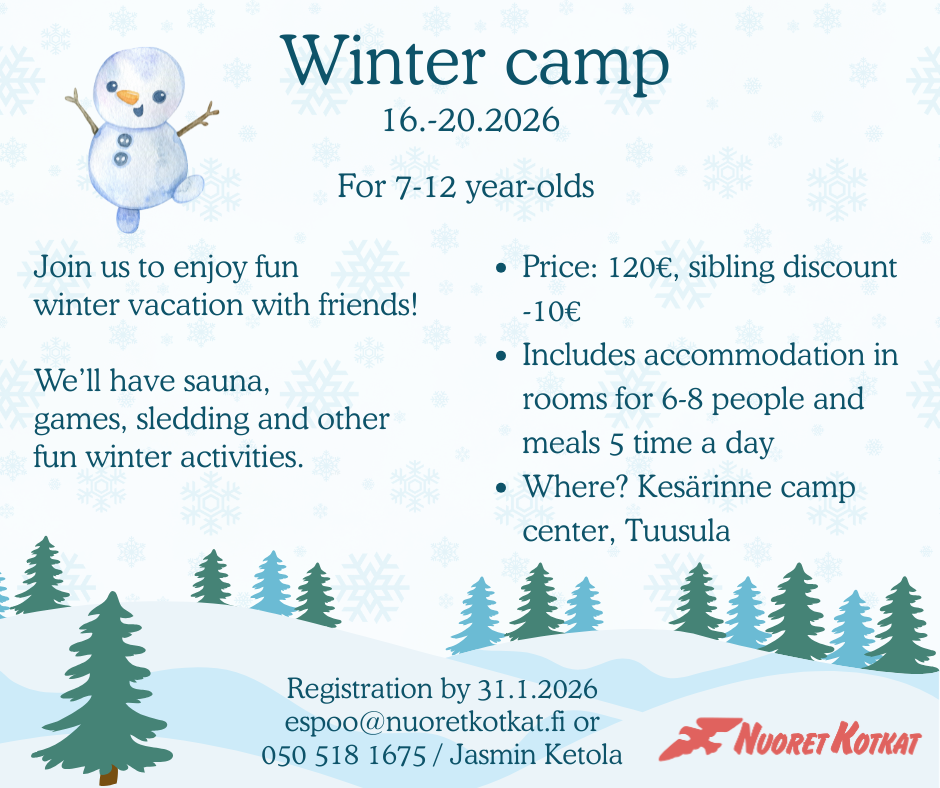For more information about our activities and events, please send an email to uusimaa@nuoretkotkat.fi or send a message to 050 518 1675 / Jasmin Ketola.